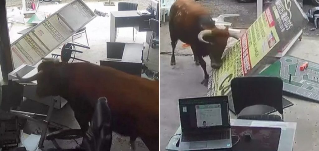 Кадри от охранителна камера показват, че бикът е съборил рекламните табели пред магазина, а след това е влязъл вътре.