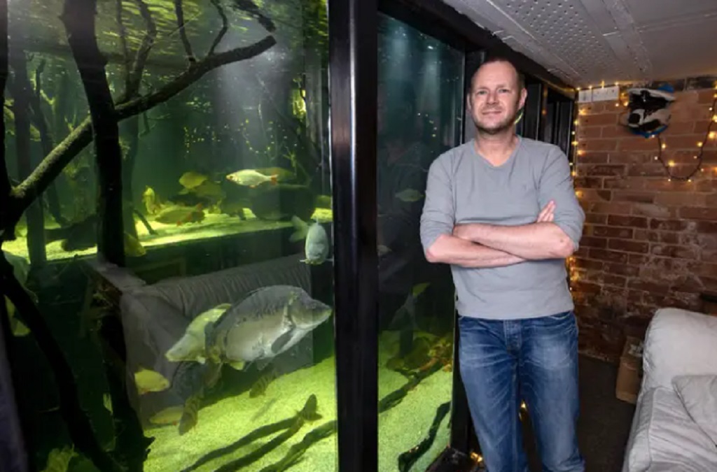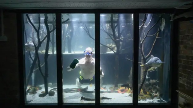 Инсталиран в мазето на къщата му, аквариумът побира близо 20 000 литра вода и тежи 22 тона.