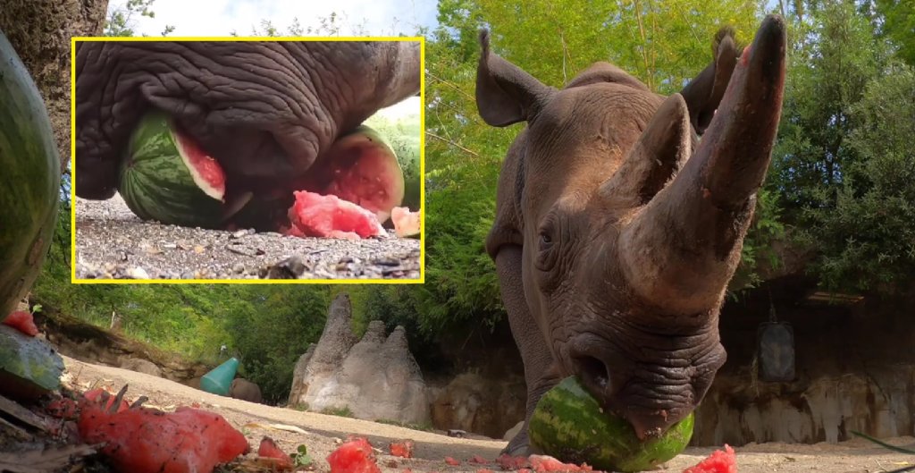 Гладен носорог излапва огромна диня за секунди - ситуацията е заснета на видео. В такъв топъл слънчев ден се яде точно диня. Плодът засища добре и има огромно съдържание на полезни вещества и вода.