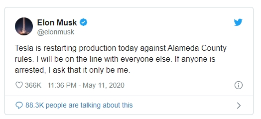 В Туитър той написа: "Tesla днес рестартира производството срещу правилата на окръг Аламеда. Ще бъда на линия с всички останали. Ако някой бъде арестуван, моля да съм само аз".
