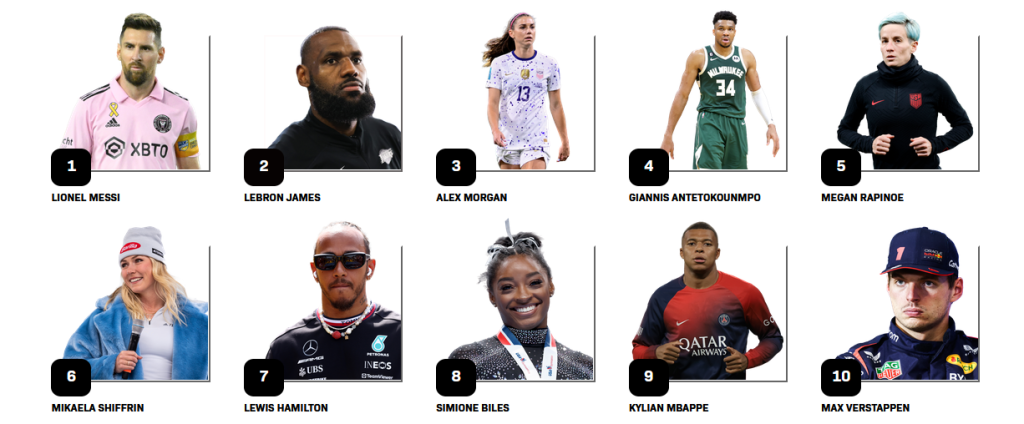 В челната 10-ка намират място двама пилоти от Формула 1 - Люис Хамилтън и Макс Верстапен, а Килиан Мбапе е единственият друг представител на мъжкия футбол, освен Меси, в топ 10. Там също място намират още две дами от щатите. Скиорката Микаела Шифрин и гимнастичката Симон Байлс.