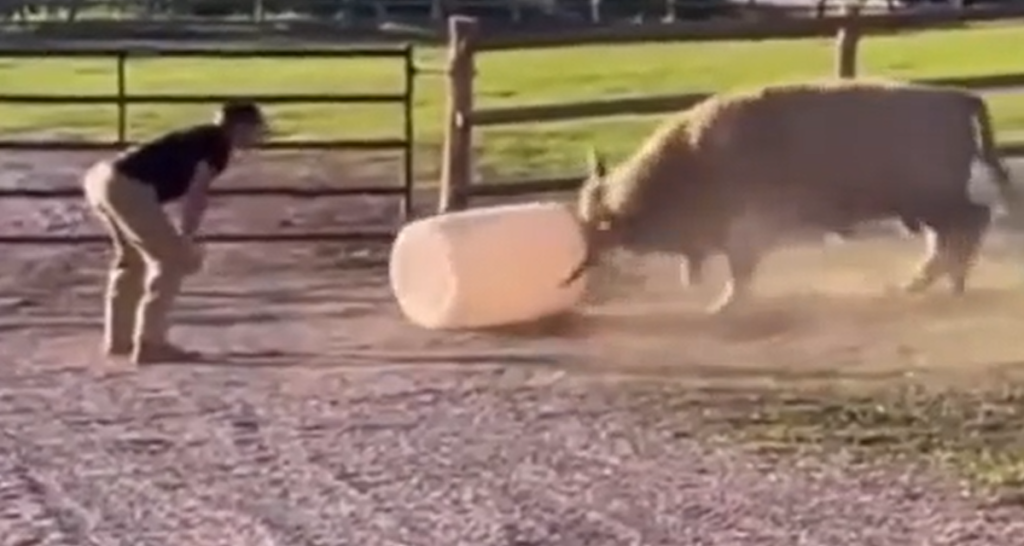 Вижте как мъж и бик си играят с варел. Животното видимо се забавлява доста със стопанина си, гонейки търкалящия се варел.