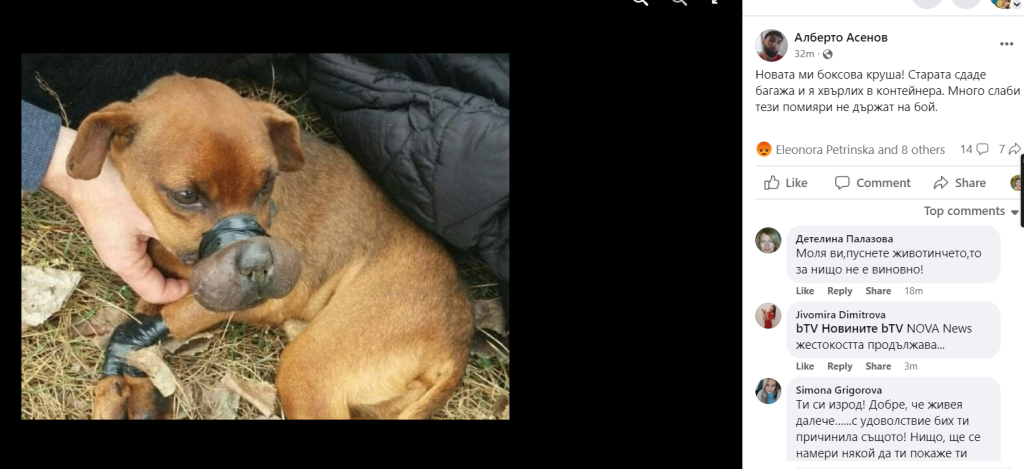 Страница с името Алберто Асенов е публикувала снимка на малко куче със следното описание: "Новата ми боксова круша! Старата сдаде багажа и я хвърлих в контейнера. Много слаби тези помияри не държат на бой".