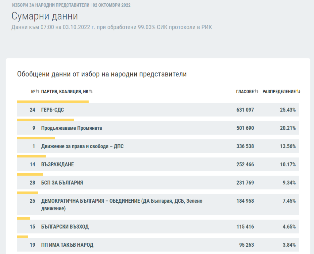 При 99,03% обработени протоколи в ЦИК: 7 партии влизат в следващия парламент. Това показват данните на Избирателната комисия към 7:00 часа днес. Все още се очакват финални резултати от секциите в чужбина, както и от няколко области в страната.