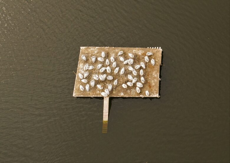 За да направят платформите още по-атрактивни за пеликаните и да им покажат, че са безопасни и подходящи за гнездене, биолозите използват интересен и иновативен подход