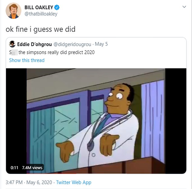 Бил Оукли, бивш сценарист на анимационния сериал „Семейство Симпсън“, призна, че шоуто наистина е „предсказало 2020 година“, пише The Independent.