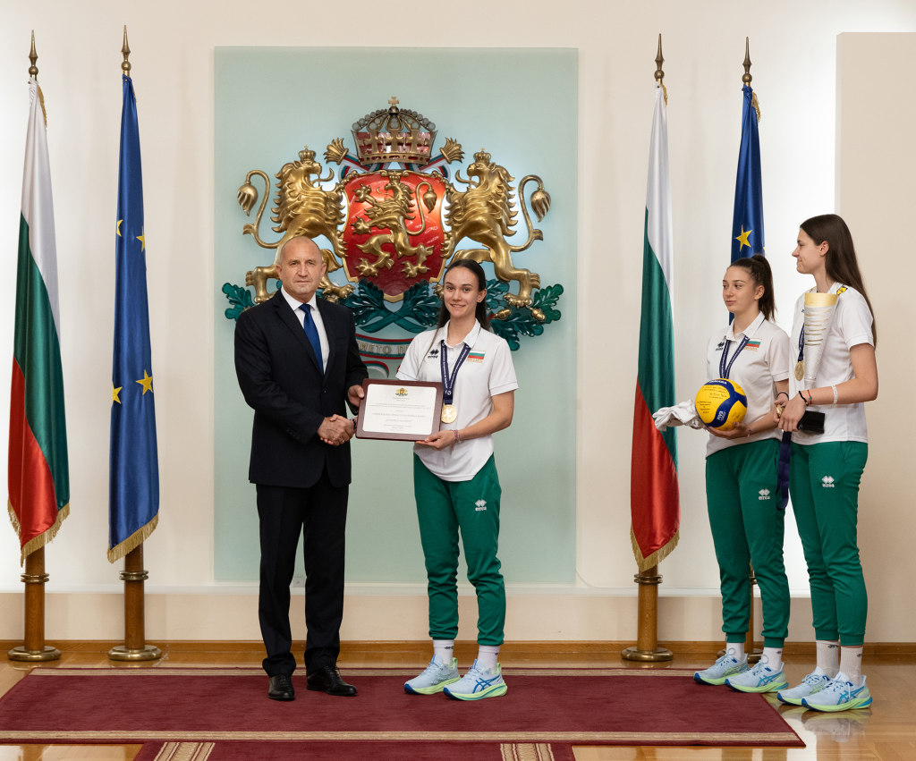 Радев връчи почетен плакет на женските ни национали по волейбол. Държавният глава удостои с Почетен плакет на Президента на Републиката националния отбор на България по волейбол за жени до 18 години на тържествена церемония в Гербовата зала на „Дондуков“ 2.