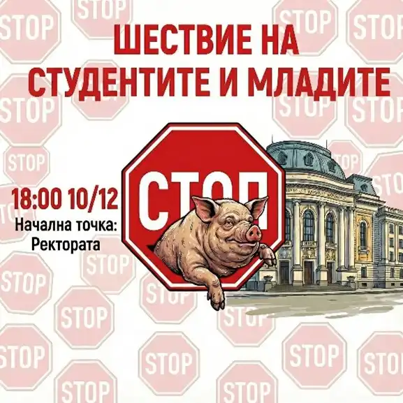 Студентското движение СТОП, организира шествие на младите и студентите, което да се събере и да се влее в официалното събитие пред парламента и министерски съвет. Сборният пункте е в 18 часа пред ректората на Софийски университет.