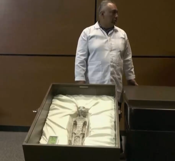 Мексиканският журналист и дългогодишен НЛО ентусиаст Хайме Маусан показа на политиците на изслушването във вторник две малки „тела“, изложени в кутии, с три пръста на всяка ръка и продълговати глави. Той твърди, че те са открити в Перу през 2017 г. и не са свързани с никакъв живот на Земята.