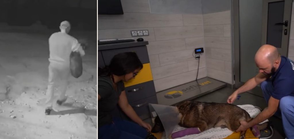 На кадри от охранителни камери в района се вижда как мъж примамва с храна доверчивото куче, отнася го някъде и след това го връща на същата улица, но в безпомощно състояние.