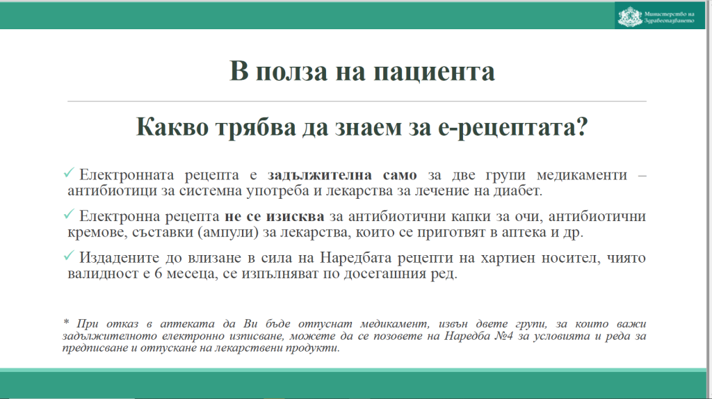 Електронната рецепта е задължителна само за две групи медикаменти- антибиотици за системна употреба и лекарства за лечение на диабет. Електронна рецепта не се изисква за антибиотични капки за очи, антибиотични кремове, съставки (ампули) за лекарства, които се приготвят в аптека и др., се казва в съобщението.