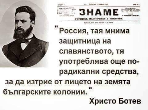 Друг наш герой - Христо Ботев, също не крие негативното си отношение към Русия. Той вижда страха на държавата с имперски амбиции от развитието на България и от възможността за силна държава на Балканите, която би ограничила руското влияние по тези географски ширини. Преди месеци бившият премиер Кирил Петков цитира Ботев по отношение на Русия. Вместо да се вслушат в думите му претендиращите за исторически знания "патриоти" го освиркаха. Истината за позицията на героите ни за агресора-Русия явно е болезнена за тях.
