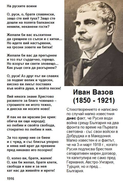 Патриархът на българската литература Иван Вазов в началото на творчеството си е русофил и пише хвалебствени слова за руската страна. Ho по-късно той осъзнава каква е истинската роля на Русия в Европа и акцентът в творбите му се променя. Тези две линии на творчеството на Вазов съвпадат с две исторически събития - Руско-турската война го превръща в русофил, защото тогава той вярва в добрите намерения на "русите братушки", както сам ги определя. По време на Първата световна война обаче Вазов прозира истинската цел на Русия и открито критикува поддържащите я. Причината - тогава Русия води война срещу българите на два фронта - в Добруджа и в Македония. Така писателят разбира, че Русия е готова да убива българи, за да постигне целите си на всяка цена.