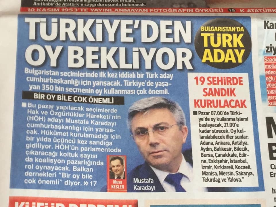 "ТУРСКИ КАНДИДАТ В БЪЛГАРИЯ ЧАКА ГЛАСОВЕ ОТ ТУРЦИЯ. За първи път претенциозен турски кандидат се впуска в президентската надпревара. Много е важно да гласуват 350-те хил. избиратели, живеещи в Турция. Всеки един глас ще бъде много важен за ролята на ДПС в пазарлъците за коалиция. В 19 града ще има секции за гласуване..."