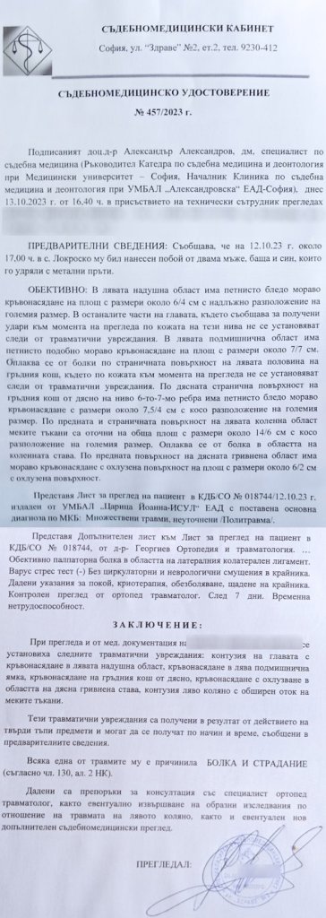 Потърпевшият отишъл да си вземе кафе от магазин в центъра на с.Локорско, община Нови Искър. Там имало събрани хора, някои от които във видимо нетрезво състояние. Те започнали да подвикват след него да си махне буса, който е паркирал пред магазина. Той не обърнал внимание на виковете. След малко обаче двама мъже започнали да го удрят, той стъпил на криво и изкъочил крака си. На място се притекла жена, която помолила потърпевшия да си тръгне. Така и направил. Но малко по-късно, усещайки, че не е способен да шофира, той спрял. Тогава двамата агресивни мъже отново го настигнали и този път един от тях го е налагал с метален прът. Вследствие на ударите потърпевшият е с множество травми, както става ясно и от медицинската експертиза: