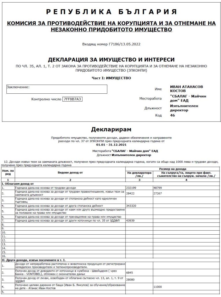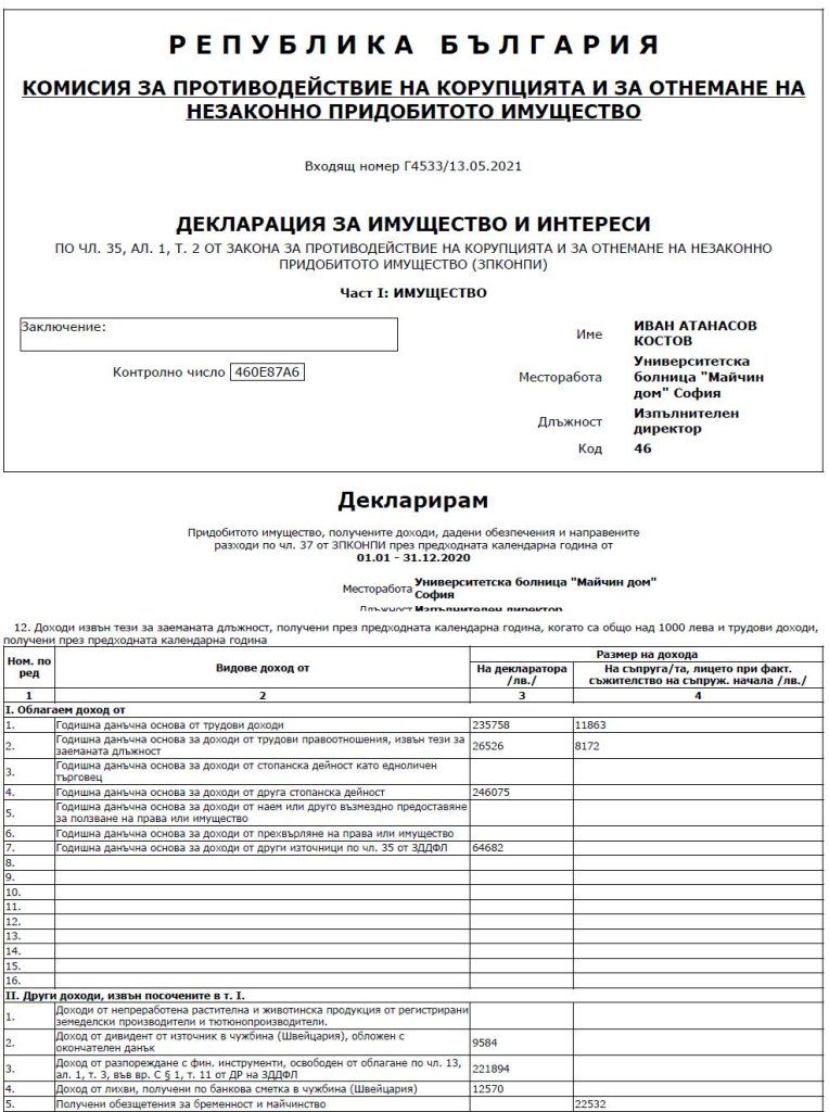 В същото време годишната данъчна декларация на проф. Костов показва, че през 2021 година декларираните му приходи са 817 089 лева. От тях 573 041 са от различни трудови правоотношения.