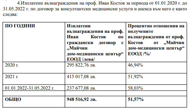 Във въпросния документ виждаме няколко интересни цифри. Според него директорът на Майчин Дом е получил от Медицинския център на “Майчин дом” по граждански договор близо 950 хиляди лева за 2 години и половина или повече от 50% от общия размер на възнагражденията на медиците в центъра.