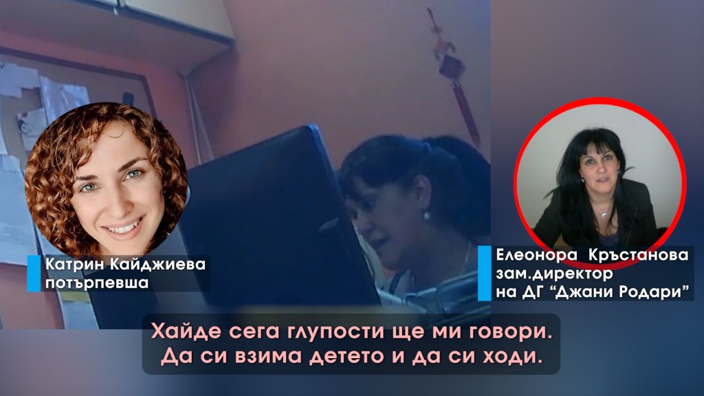 В опит да рабере защо се стига до отстраняването на детето Катрин отиде в детската градина със скрита камера. Тя засне грубото отношение на заместник-директорката Елеонора Кръстанова, която повишава тон, но така и не отговаря с какво желанието на Катрин Кайджиева да напусне работа е обвързано с договора за обучението на детето.