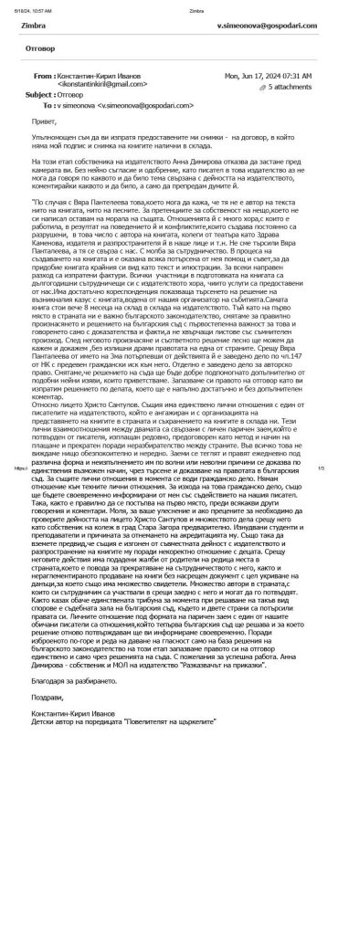 Професор Сантулов е успял да се свърже с управителката на издателството "Разказвачът на приказки". Ето и какъв отговор е получил: