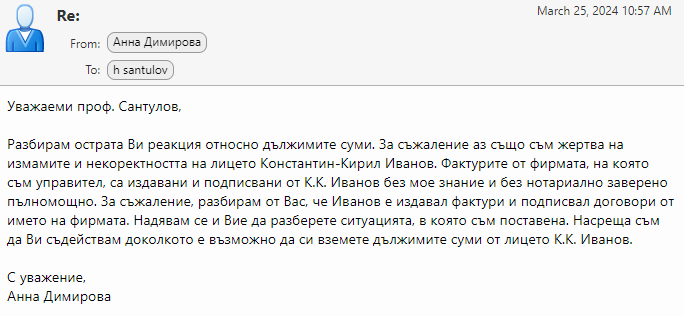 Изглежда или и тя е потърпевша наистина, или имейлът е част от съвместната ѝ работа с Константин-Кирил Иванов. Междувременно в имейл до нас той твърди, че е упълномощен да отговаря от нейно име. Ето и пълният му отговор, за фактите в който не носим отговорност: