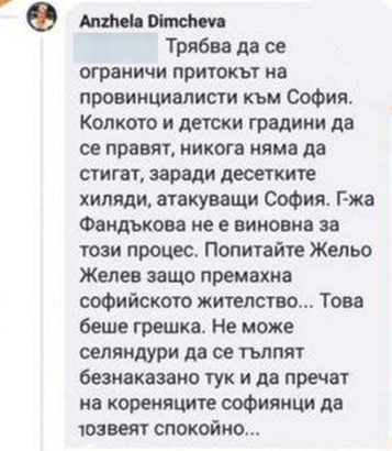 „Tрябва да се ограничи притокът на провинциалисти към София. Колкото и детски градини да се правят, никога няма да стигат, заради десетките хиляди, атакуващи София… Не може селяндури да се тълпят безнаказано тук и да пречат на кореняците софиянци да живеят спокойно…“
