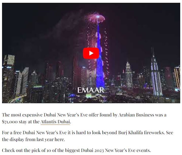 Започваме с една от най-скъпите дестинации в света: Дубай. Най-известният и скъп хотел там “Атлантис” предлага неустоима нощувка на цена от 71 000 долара. Гост-звезда там ще бъде Кайли Миноуг. Гледката на фойерверките обаче и възможността поп звездата да пее на метри от масата, отрупана с гурме специалитети, явно си заслужава. Вече всички места в Дубай са резервирани, а възможностите човек да наблюдава фойерверките без резервация също са напълно ограничени.